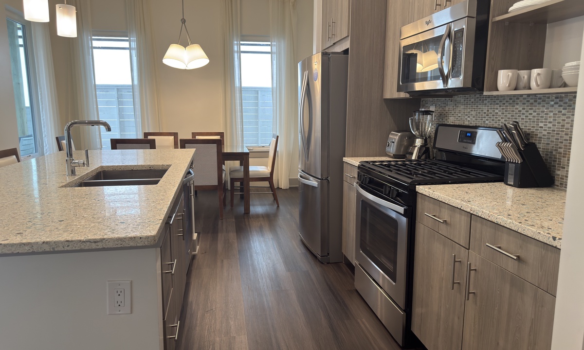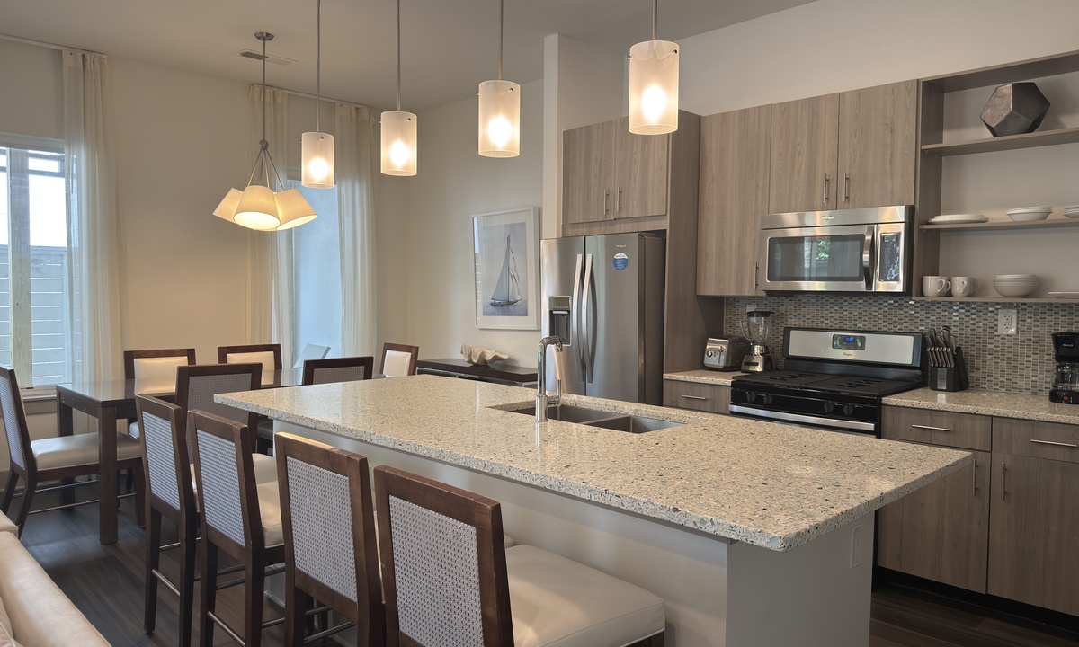 Enjoy a fully equipped kitchen featuring sleek quartz countertops, stainless steel appliances, and an oversized island with seating—perfect for preparing meals or gathering with loved ones. Step outside to enjoy al fresco meals at the private patio dining table for 4.
