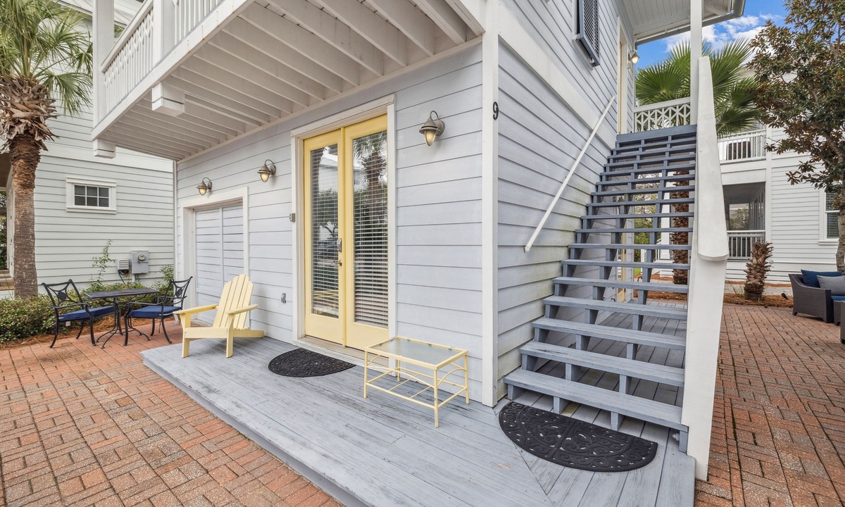 A private outdoor escape awaits with a small furnished patio and second-floor balcony.