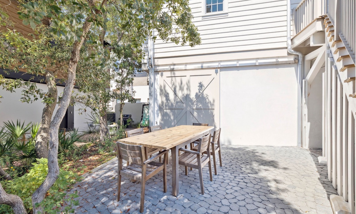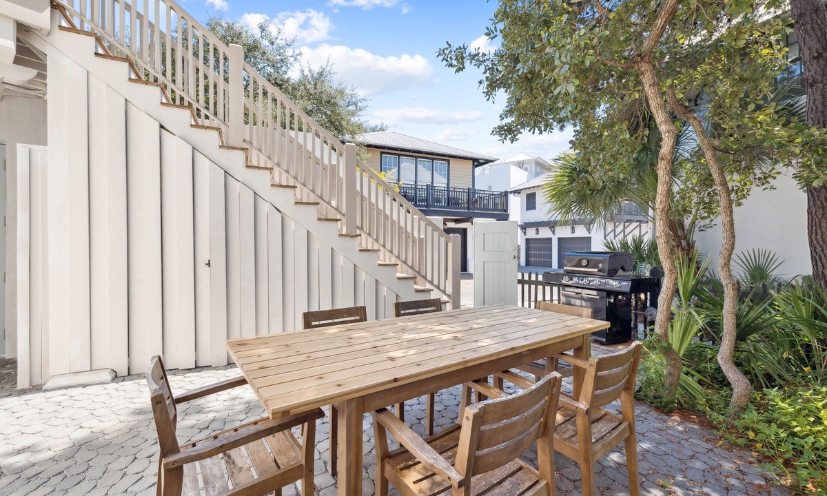 “Tuscan Blue” offers both convenience and charm with its thoughtfully planned outdoor spaces. A ground-level seating area is perfect for al fresco dining in a shade of the trees, while under-stairs access leads to a refreshing outdoor shower after beach outings.