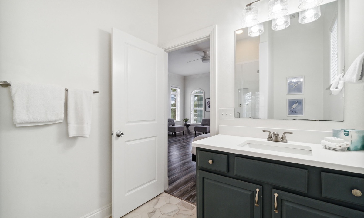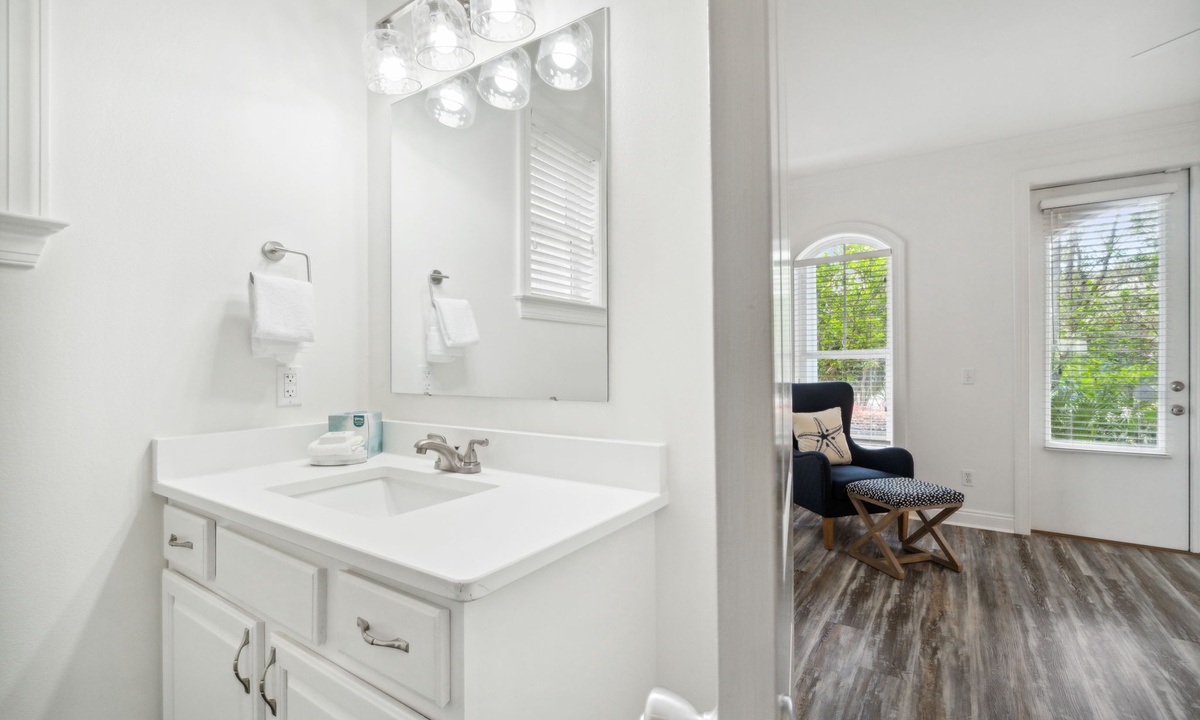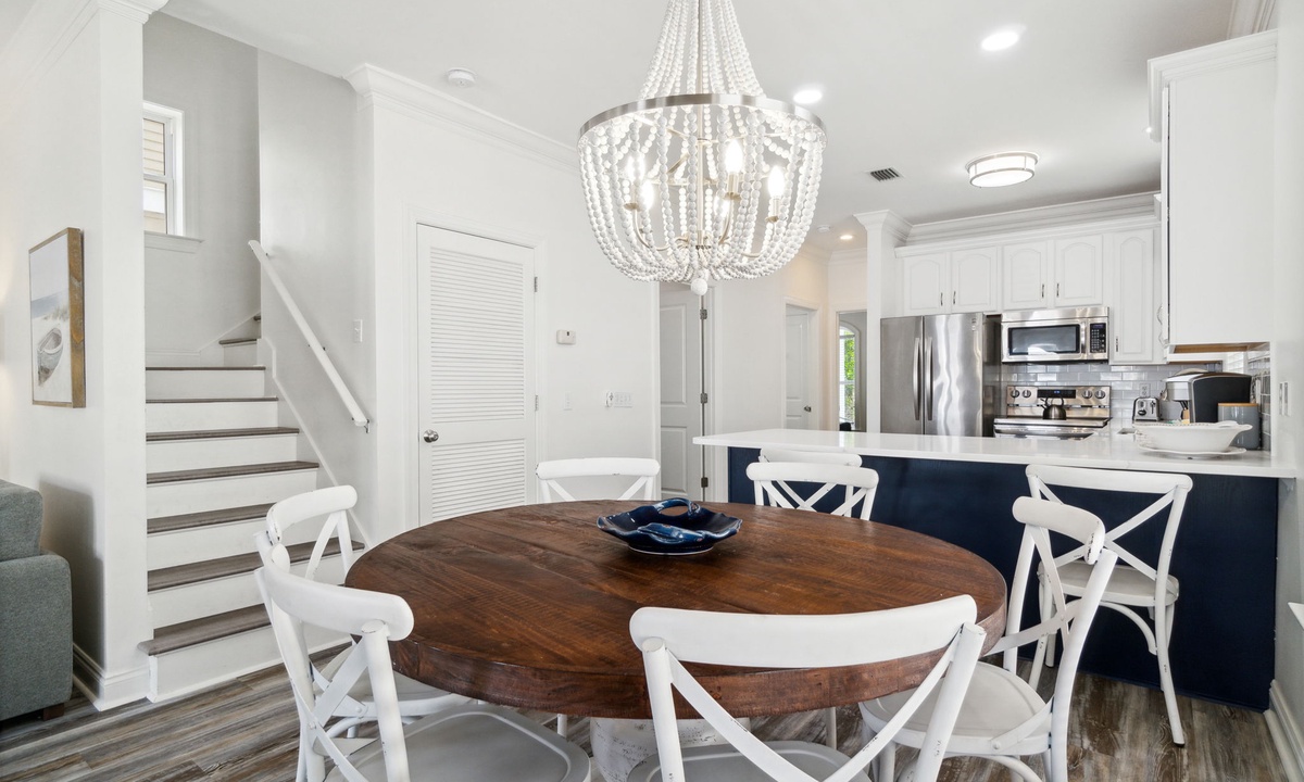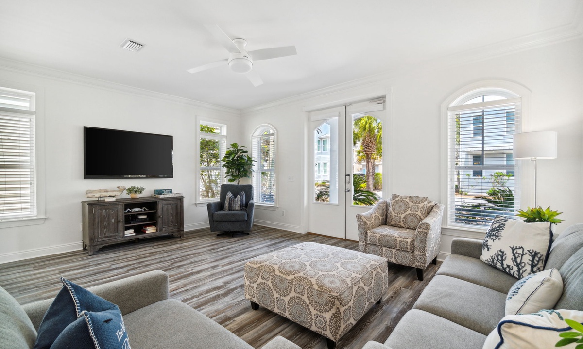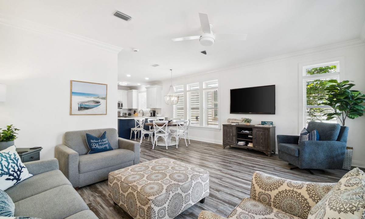 Relax in the spacious first-floor living area with plush seating and modern coastal design. It's the perfect spot to unwind after a fun day exploring 30A. Gather the family for movie nights or meals in the open-concept space.