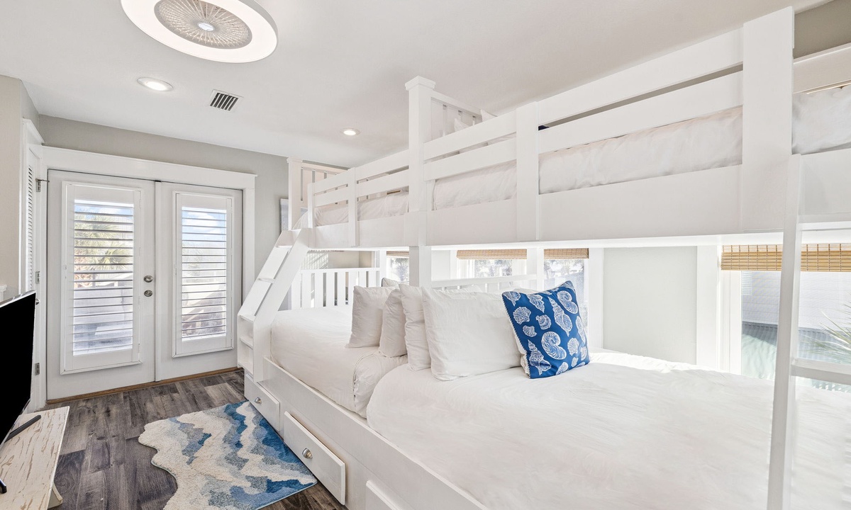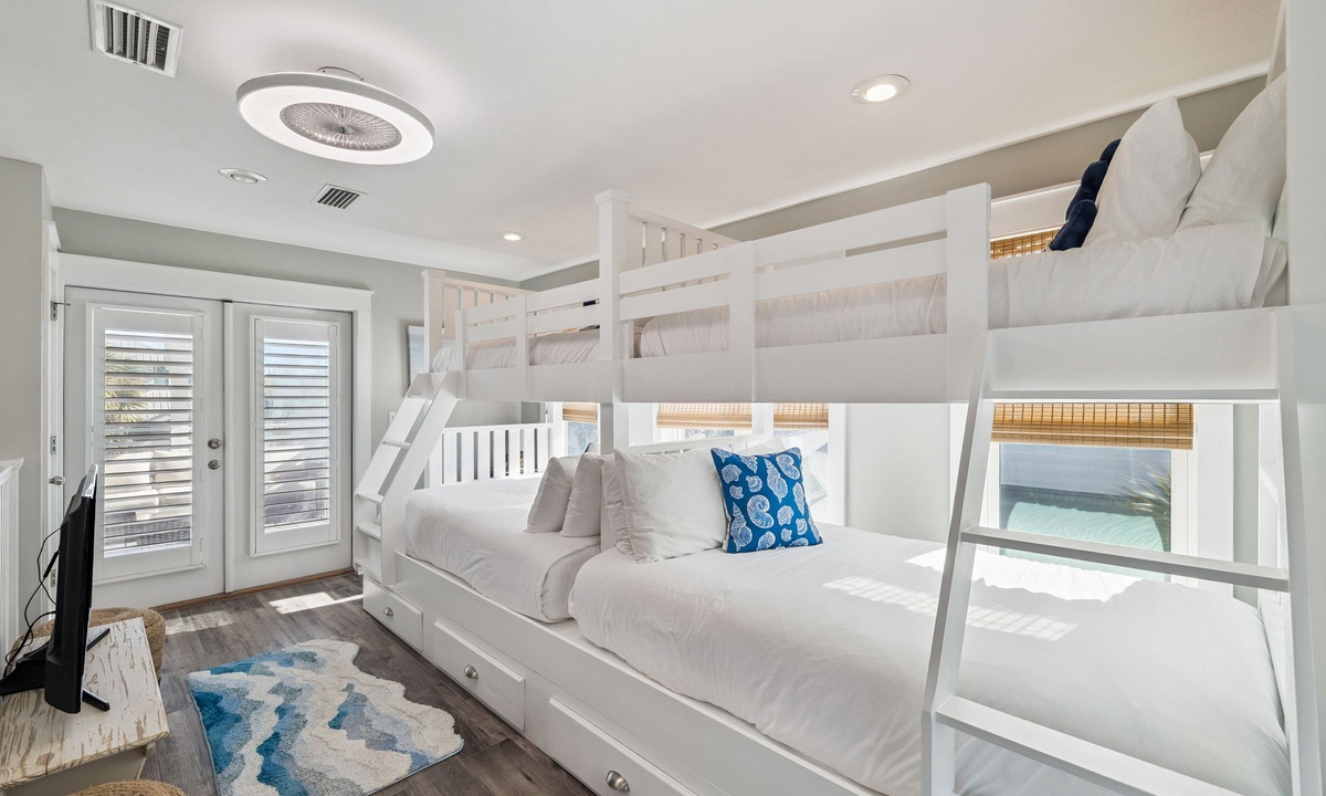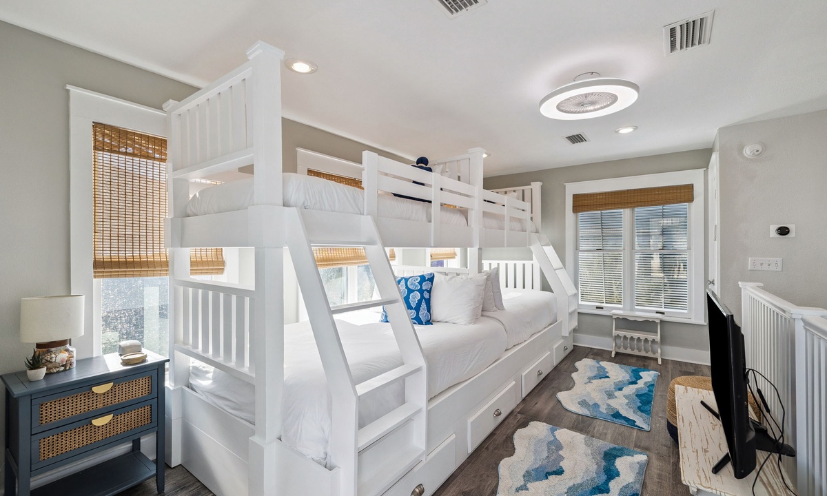- Bunk Room: Two twin-over-full bunk beds, flat-screen TV, private balcony access