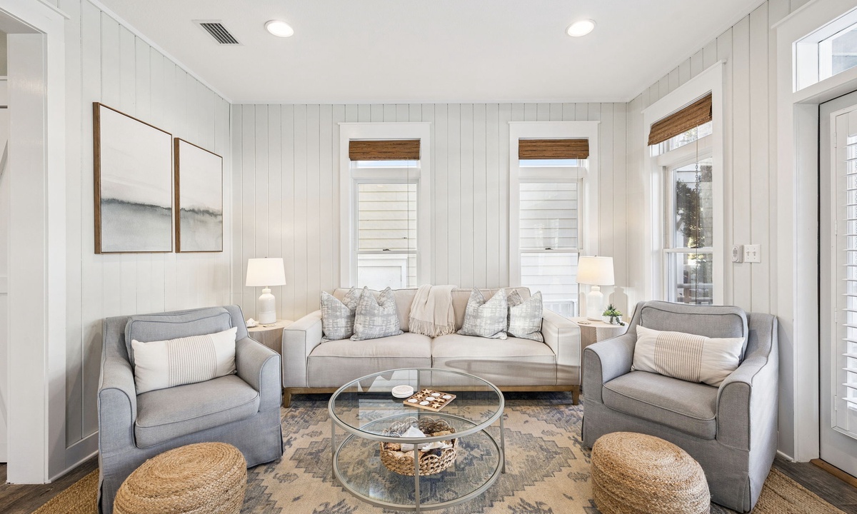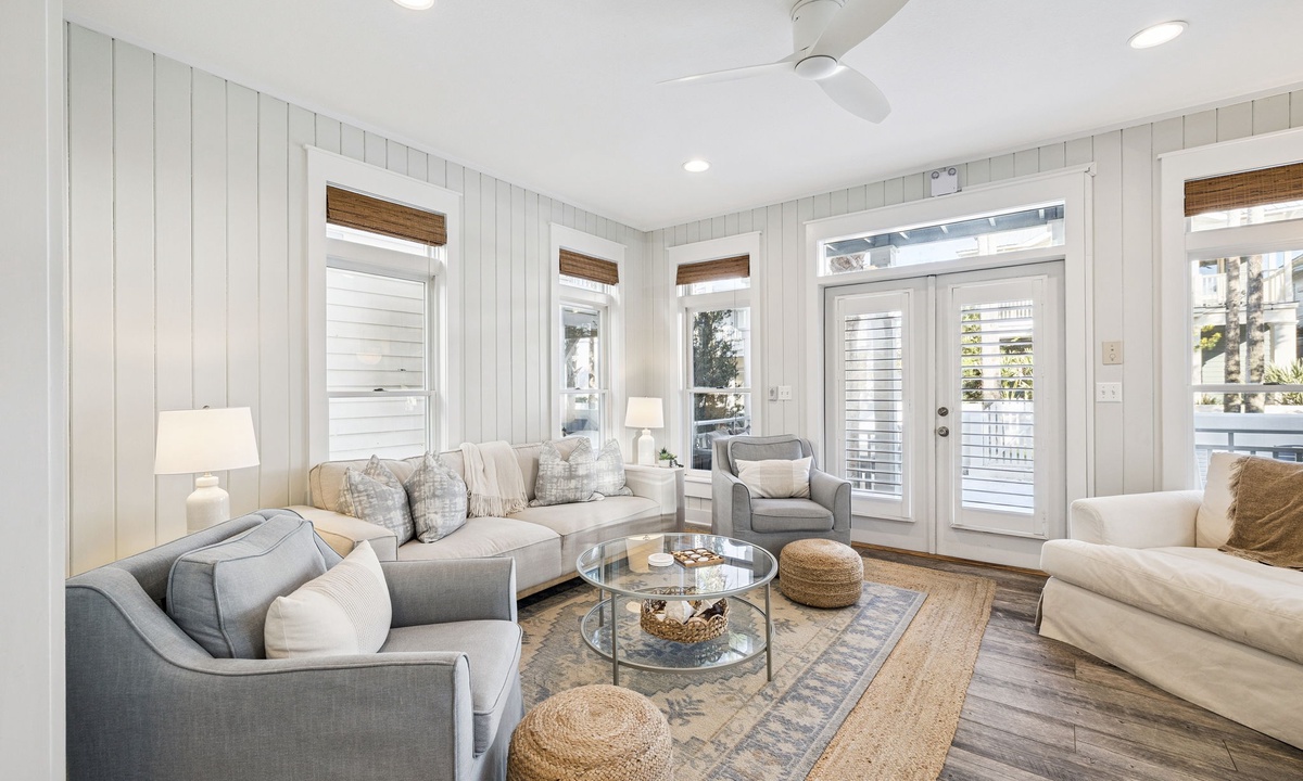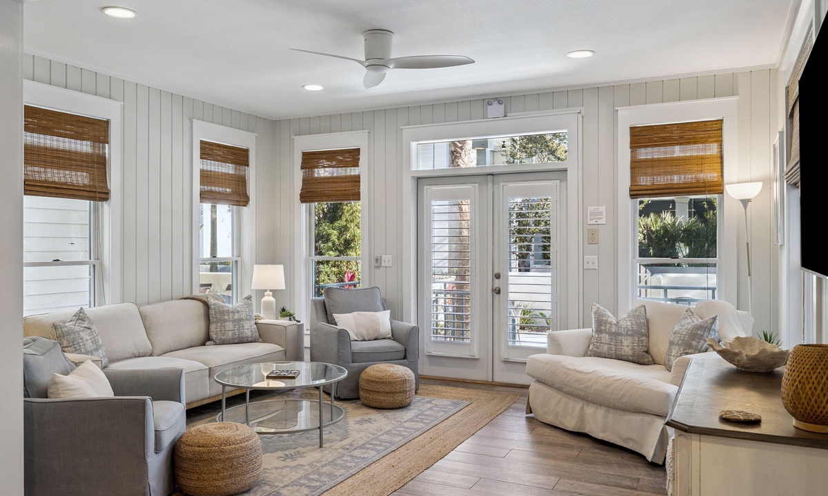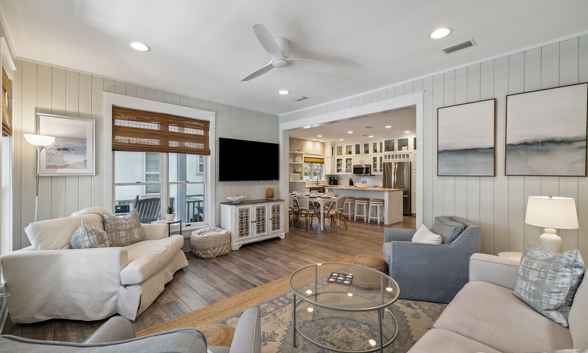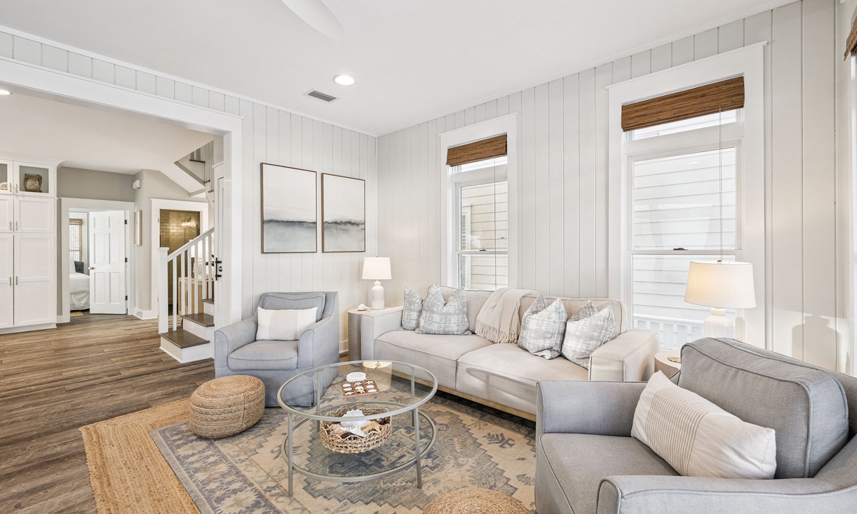 *** LIVING AREA ***On the main level, the open-concept living space invites relaxation with cozy coastal furnishings and direct access to the pool deck. Whether you're enjoying family movie night or gathering after the beach, this space is designed for connection and comfort.