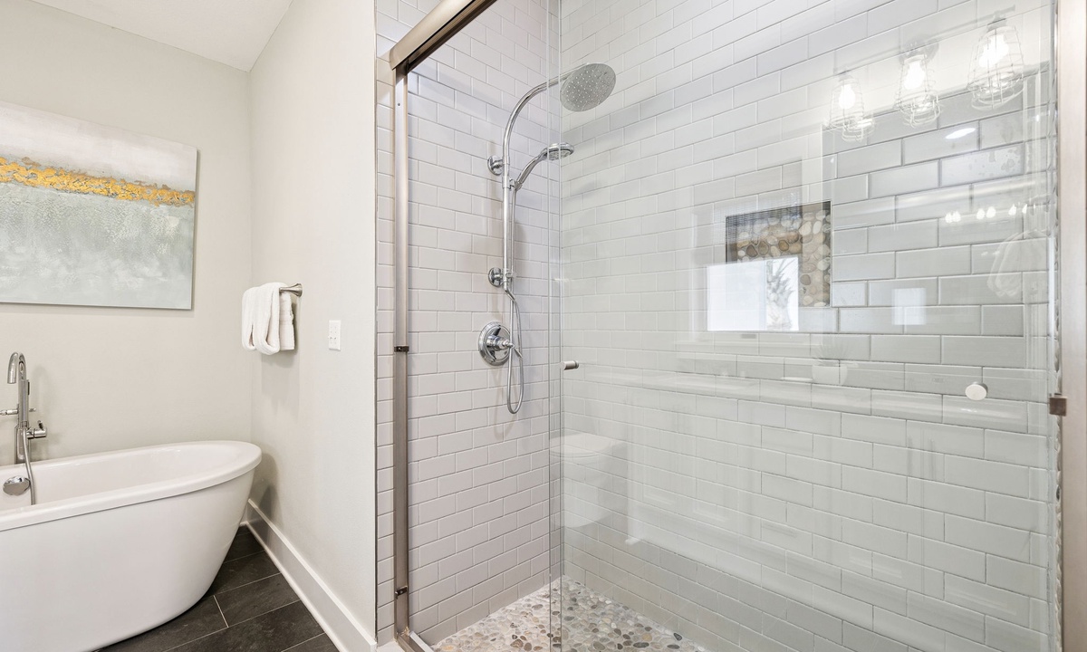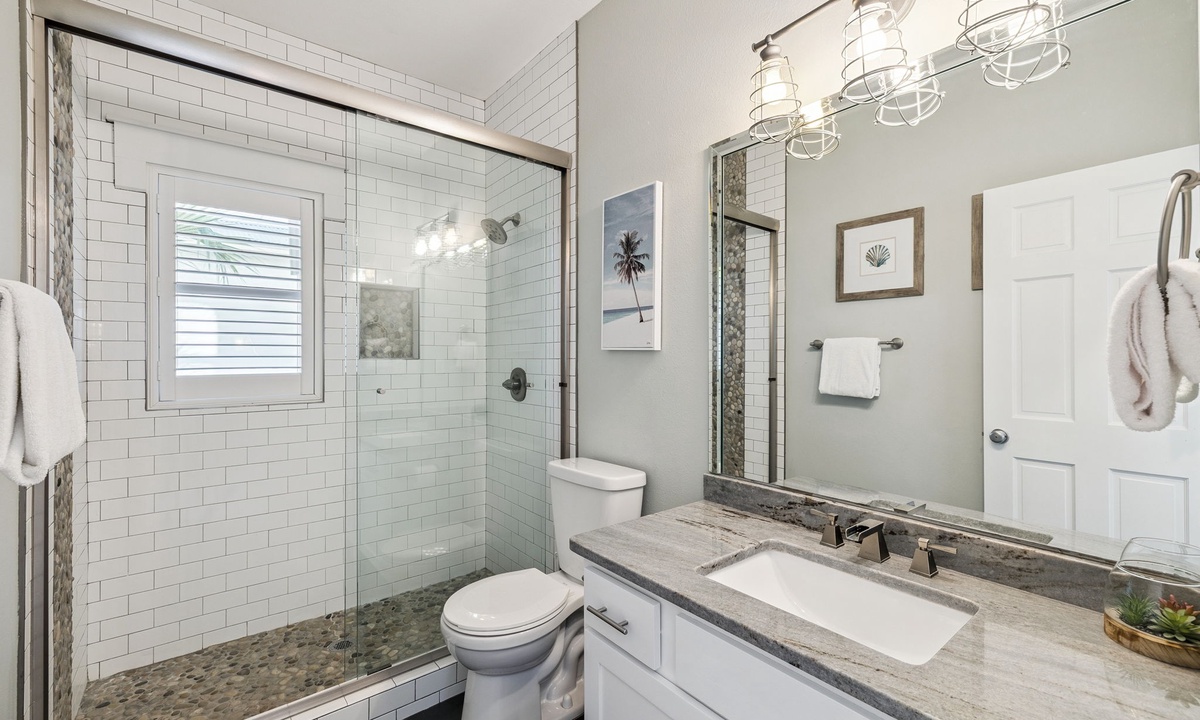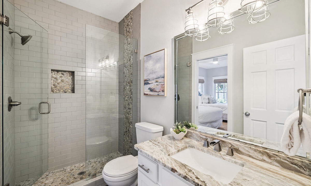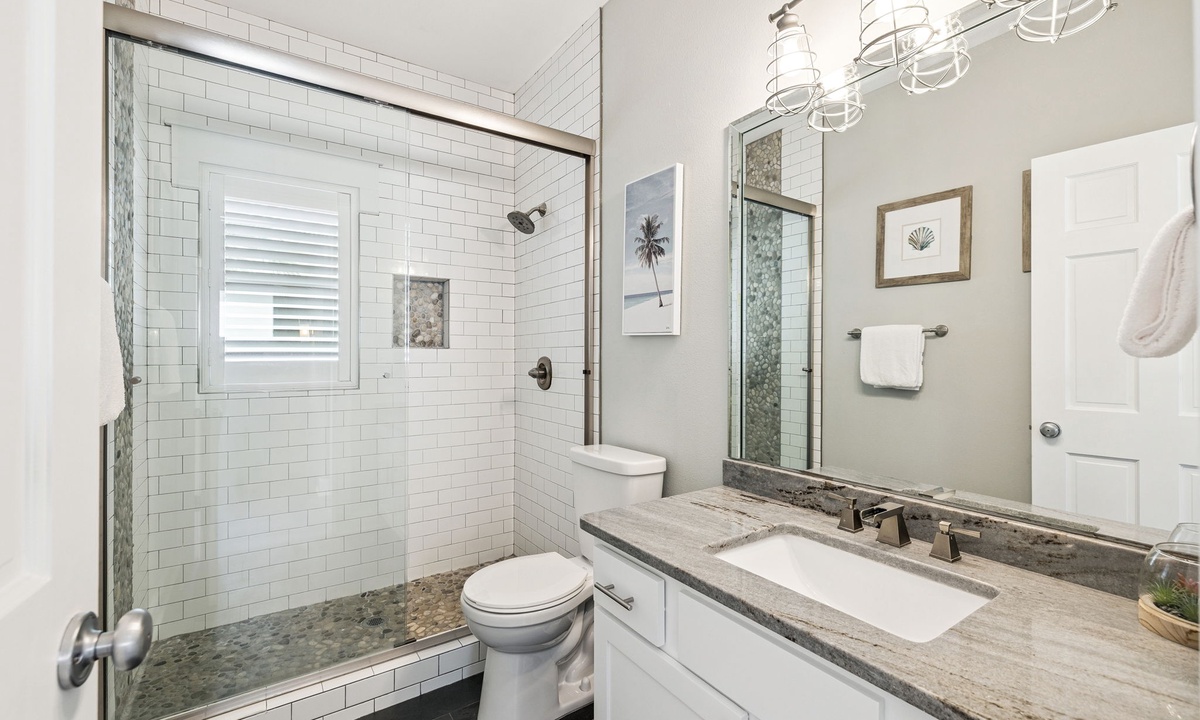 - Guest Bathroom: Shared hall bath with single vanity and walk-in shower