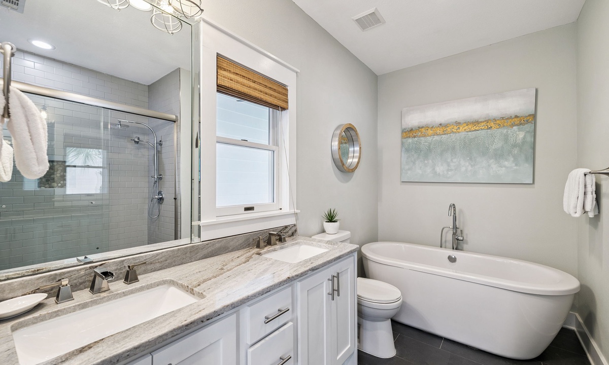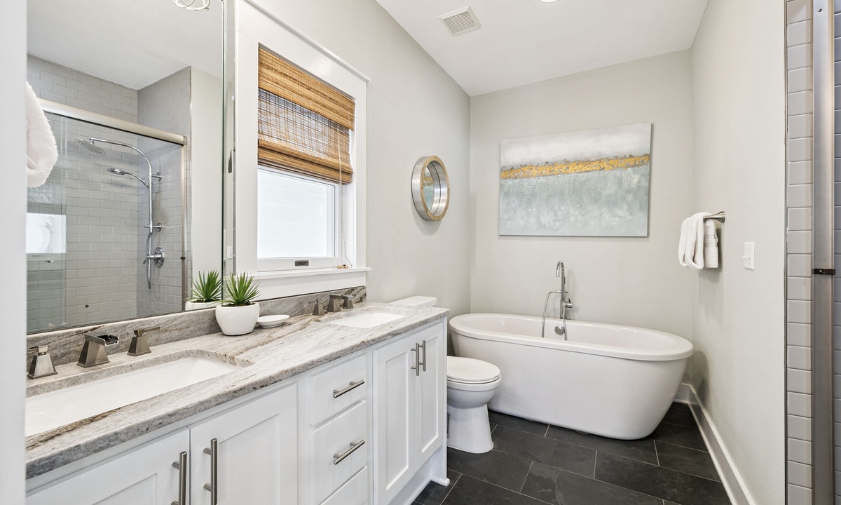 - Primary King Suite: King bed, flat-screen TV, balcony access, and spa-style en-suite with dual vanities, soaking tub, and walk-in shower