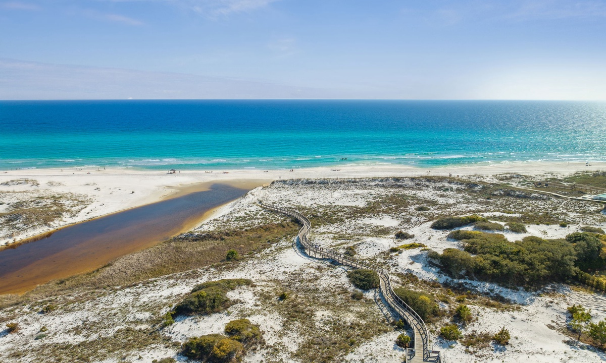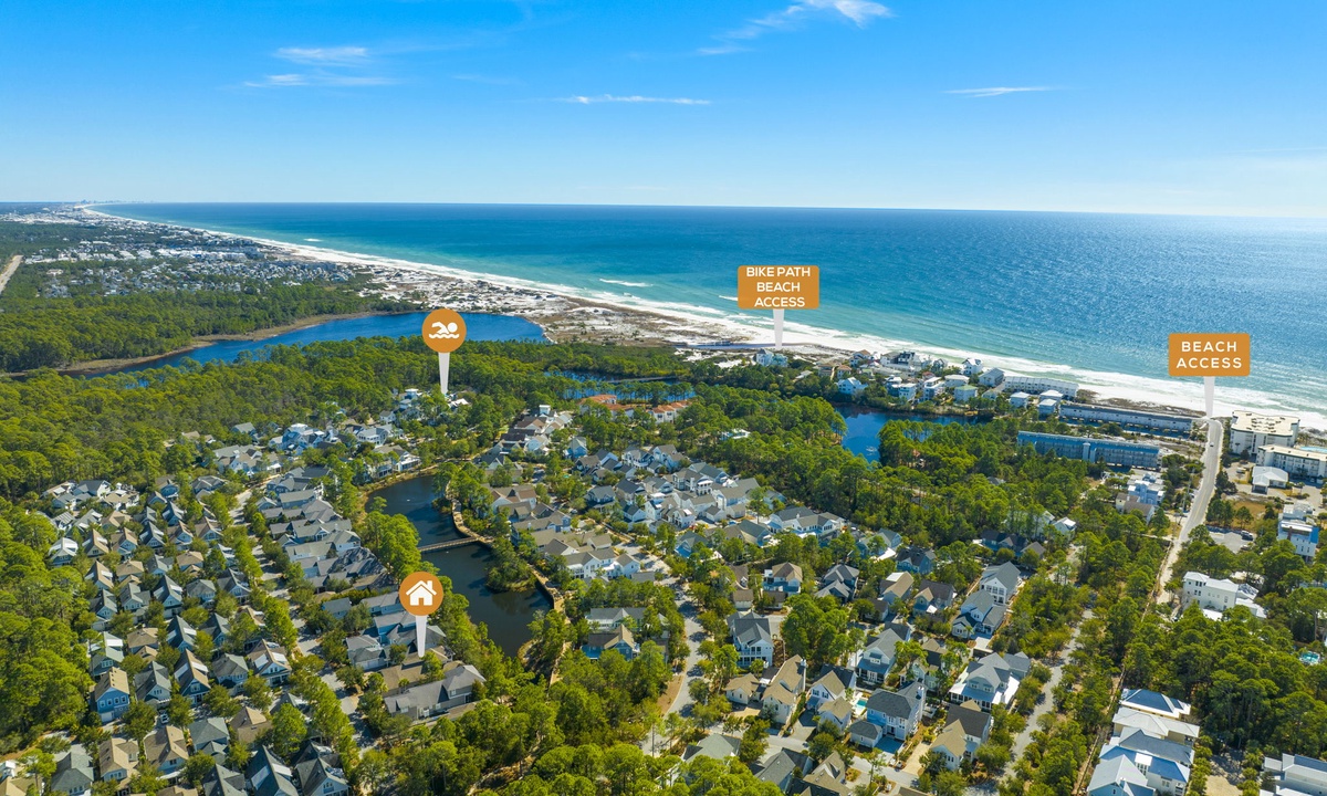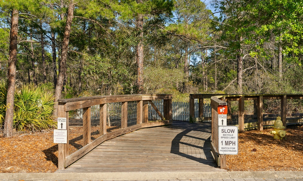 The beach access is about a 15 minute walk from the home. You can drive to the community pool & park but you will have to walk across the boardwalk as it cannot be driven on.
